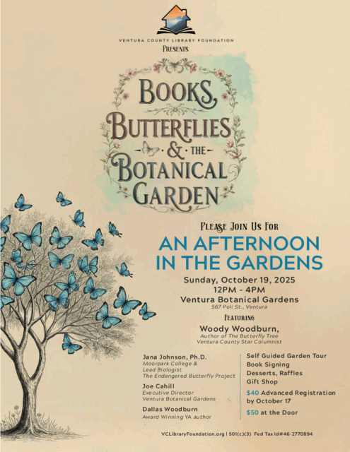Featuring Woody Woodburn, author of The Butterfly Tree and Ventura County Star Columnist. Woody will be signing copies of his book which will be for sale at the event. Hear also from Jana Johnson, Ph.D. Moorpark College and lead biologist on the Endangered Butterfly Project; Joe Cahill, Executive Director, Ventura Botanical Gardens; and Dallas Woodburn, Award Winning YA author.